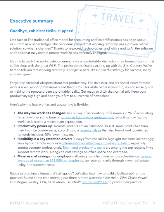 INTUIT Accountants: The Remote AdvantageOct 26, 20251 min readUpdated: Dec 23, 2025Your no-nonsense guide to remote tax and accounting, highlighting "M. Katie Helle, CPA: The flexible working mom."